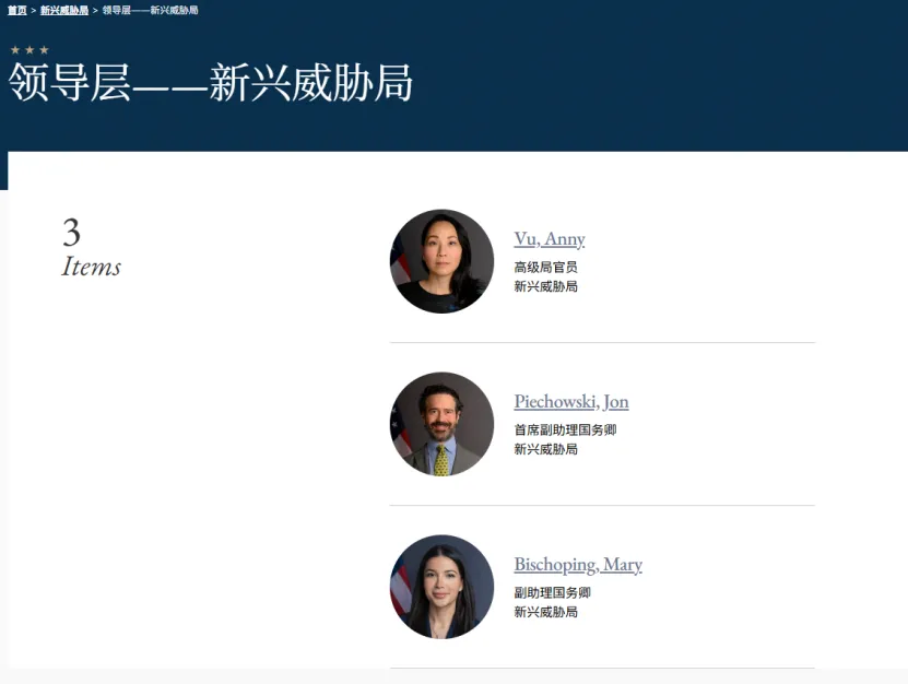 “新兴威胁局”将伊朗、中国、俄罗斯、朝鲜及外国恐怖组织作为重点关注的“新兴威胁”来源,由美国资深对华事务外交官安妮・武(Anny Vu)牵头负责。