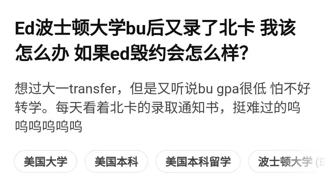 然而,当RD放榜,如果突然蹦出来一个“哈耶普斯麻”的Offer,或者某个排名更高的梦校向你招手,原本的喜悦瞬间就能变成痛苦的纠结。于是,社交媒体上开始涌现出各种求助帖:“ED录了纽大,RD中了哥大,怎么才能撕掉ED又不被追究?”“求问,ED毁约会有什么后果?能不能跟学校说家里没钱了?”