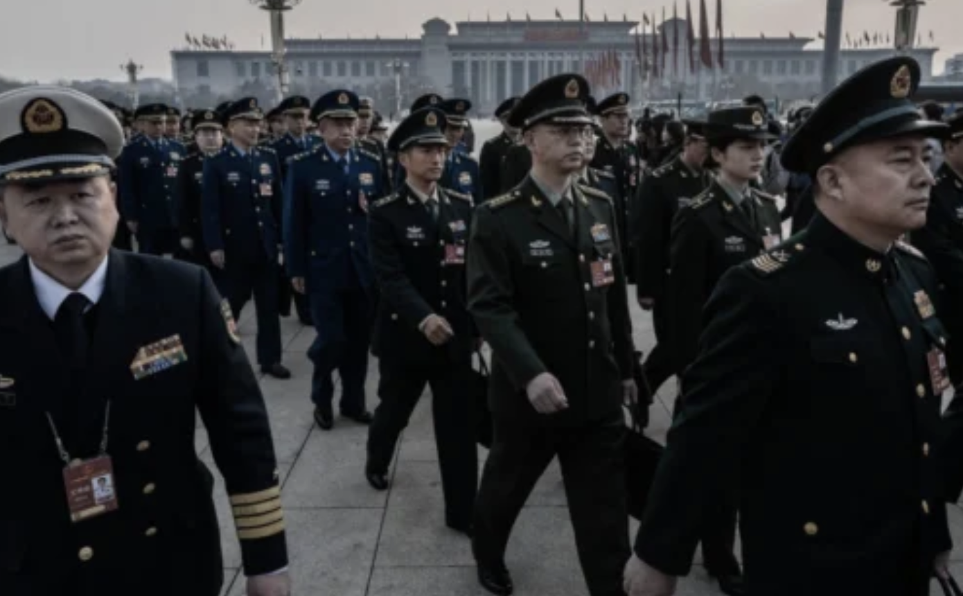 2025年3月5日,北京大会堂,中共橡皮图章式立法机构----全国人大开幕式上,军方代表列队入场。(Kevin Frayer/Getty Images)