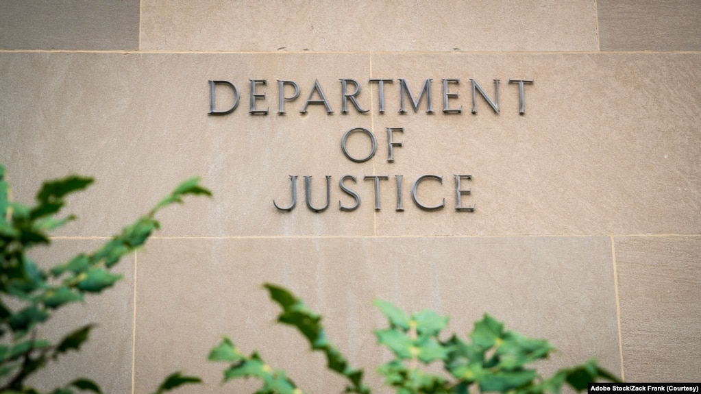 资料照片:位于美国华盛顿的美国司法部总部大楼的标识。