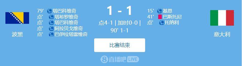第79分钟,哲科头球攻门被多纳鲁马门线上封堵,随后塔巴科维奇补射破门,帮助波黑1-1扳平比分,两队同回一条起跑线,意大利少打一人形势危险,好在多纳鲁马帮助球队拖入加时赛。
