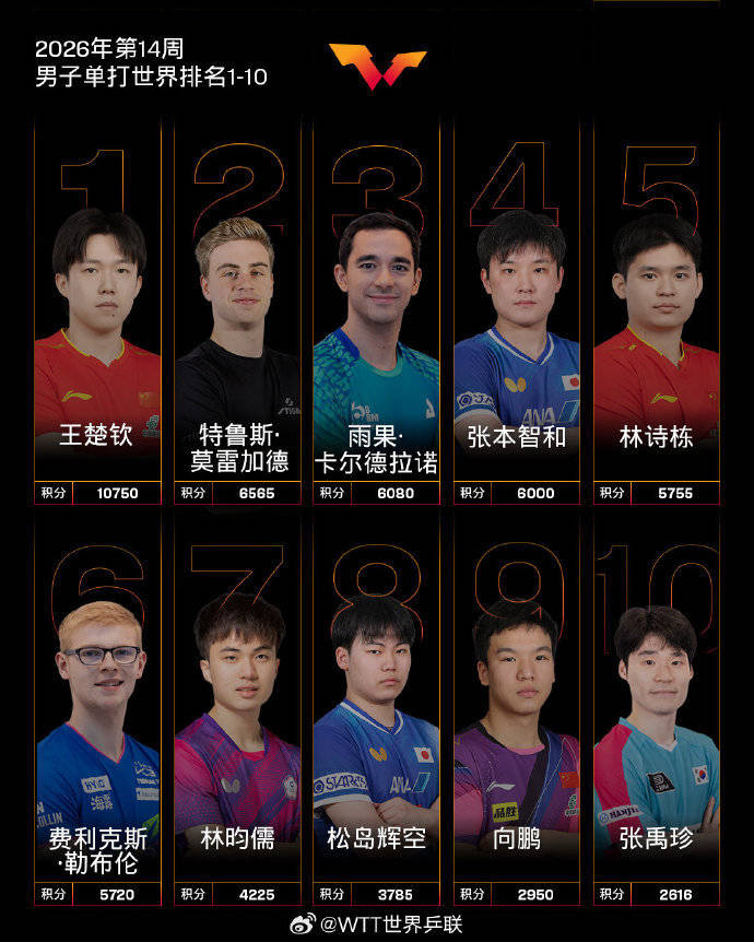 国际乒联2026年第14周世界排名,是以2026年WTT常规挑战赛突尼斯站为时间节点。中国队派出出泽杏佳、竹谷美涼,早田希娜篠冢大登5名,其中,女单没有一人打进四强。