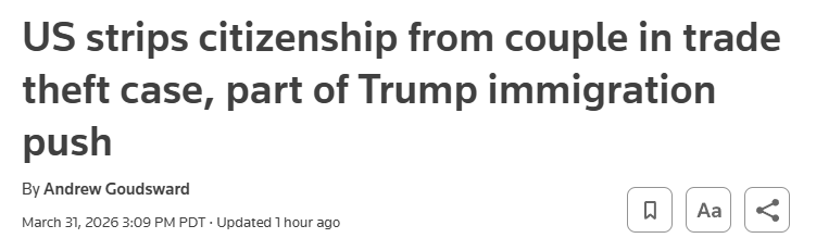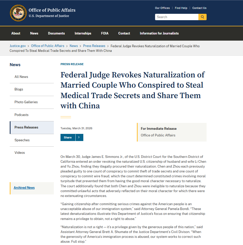 3月30日,美国加州南区联邦地区法院法官James E. Simmons Jr.签署裁定,撤销一对华裔夫妇——52的陈丽(Li Chen,音译)与55岁的周宇(Yu Zhou,音译)的归化入籍身份。