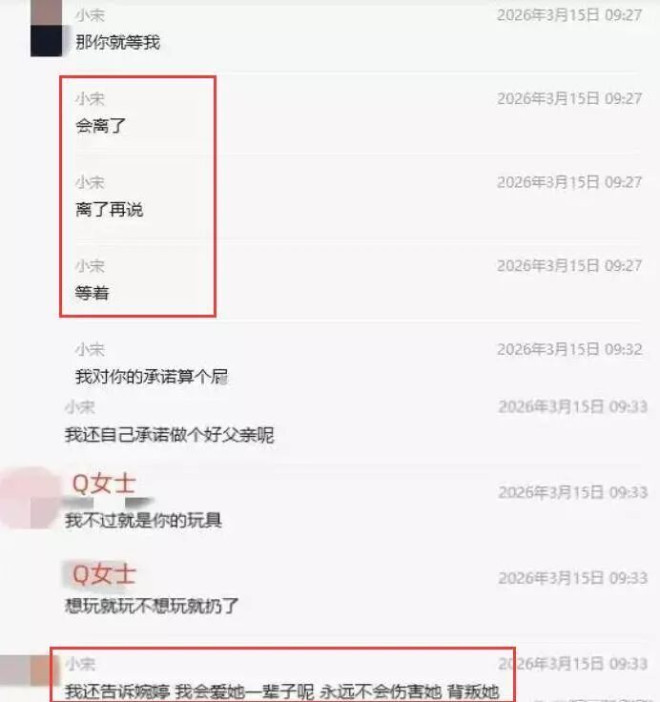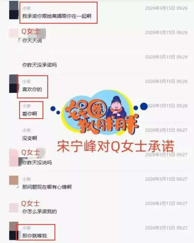 与此同时,宋宁峰与Q女士的私下聊天记录也一并公开,从内容中可以了解到宋宁峰口口声声的向Q女士做出承诺,自己会与张婉婷离婚,和她在一起。