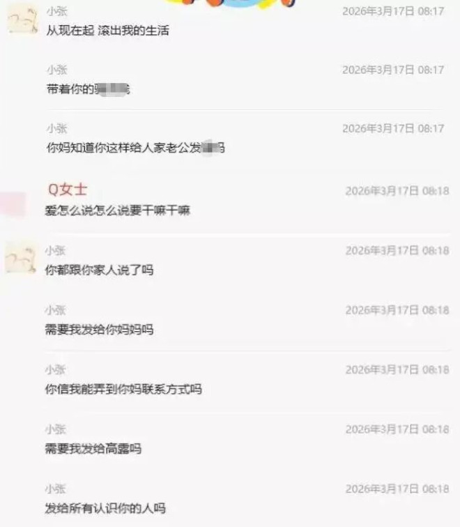 张婉婷也不是这么好糊弄的人,在得知Q女士是第三者之后,直接向其发信息予以指责,从对话记录中可以看出两人闹得是不可开交,张婉婷更是扬言要将Q女士的私密裸照发给她的家人。