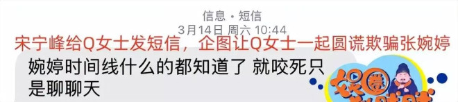 结果就在前不久,张婉婷得知自己老公出轨的事实,并且掌握了相关时间线,在听到风声之后,宋宁峰火速与Q女士提前“打招呼”,让其死不承认两人的关系,就说两人仅仅是聊聊天。