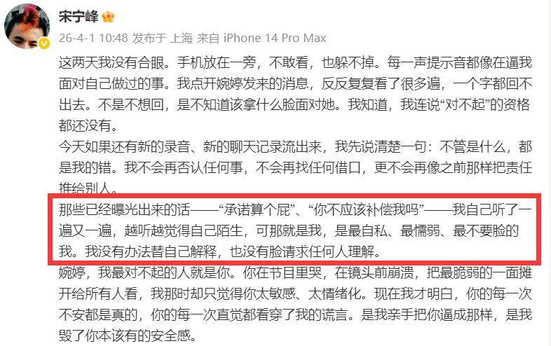 4月1日上午,继出轨瓜引发舆论之后,演员宋宁峰终于发布长文做回应。