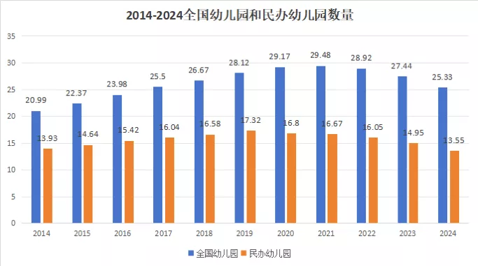 自2021年幼儿园数量达到历史峰值以来,全国幼儿园关停潮加速显现。教育部数据显示,全国幼儿园总数从2021年的29.48万所降至2024年的25.33万所(目前为止最新数据),三年间减少4.15万所。