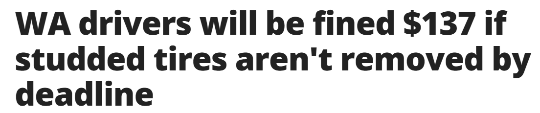 华盛顿州交通部(WSDOT)向全州司机发出紧急提醒:带有金属钉的防滑钉胎必须在3月31日结束前彻底从车辆上拆除。