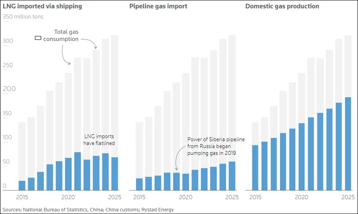 自2015年以来,中国的天然气来源相对于消费量的比例。 通过海运进口液化天然气量(左侧柱状图)相对稳定,管道天然气进口量(中间柱状图)逐年上升,国内天然气生产量(右侧柱状图)也逐年上升。 路透社制图