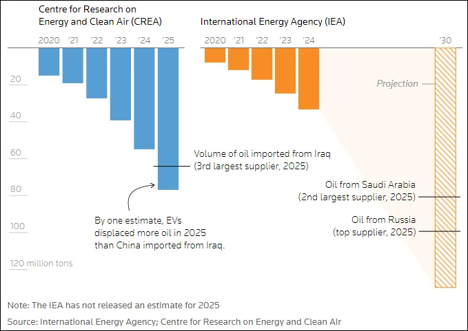 CREA的一项估算数据相当直观,去年因电动汽车普及而减少的石油消耗量,大致相当于中国从沙特阿拉伯进口的石油总量。