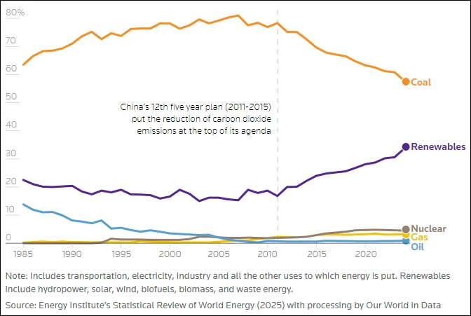 中国电力生产来源占比。2010年后,煤炭(橙色)明显开始下降,可再生能源(紫色)明显上升。 路透社制图