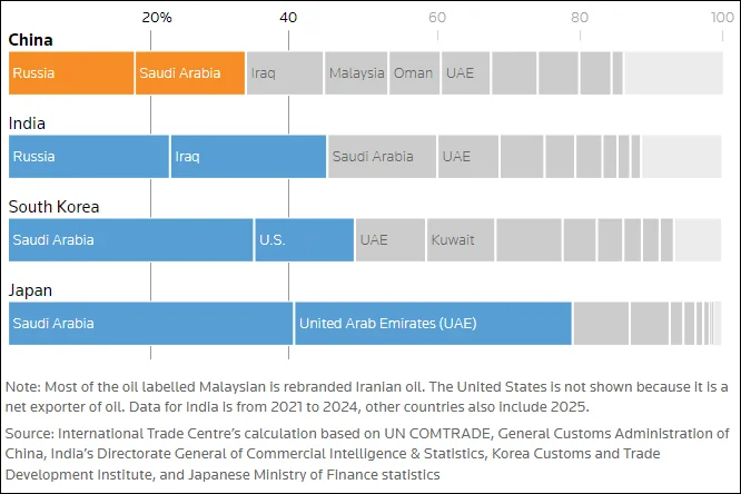 亚洲主要进口国原油进口量按来源地划分图。相比于印日韩三国,在中国石油进口中,来自单一来源的石油占比不到20%。 路透社制图