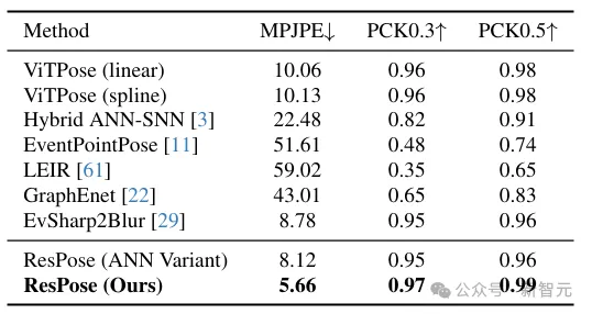 在超高频姿态估计任务中,ResPose交出了一份极其亮眼的答卷:相较于传统先提RGB特征后强行插值的方案,它将平均关节位置误差(MPJPE)大幅砍掉了约40%!