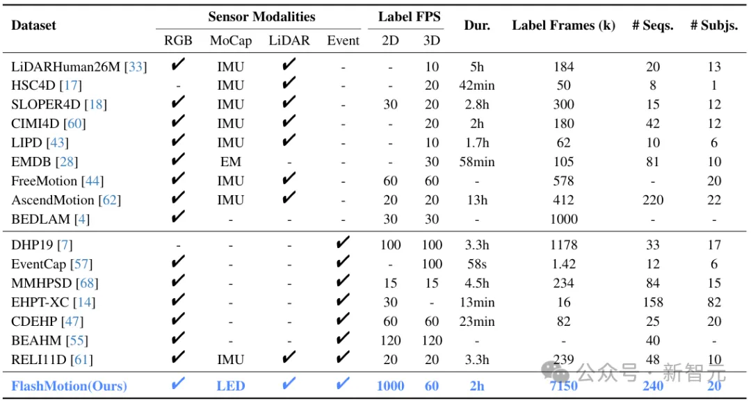 基于FlashCap系统,研究团队采集并开源了FlashMotion数据集。不仅多模态(囊括事件流、RGB、LiDAR点云和 IMU),更在数据维度上完成了真正的降维打击: