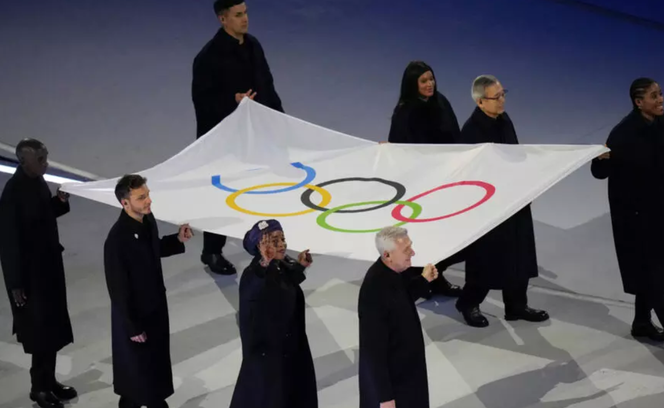 2026年2月6日星期五,在意大利米兰举行的2026年冬季奥运会开幕式上,奥林匹克会旗升起。 AP - Francisco Seco
