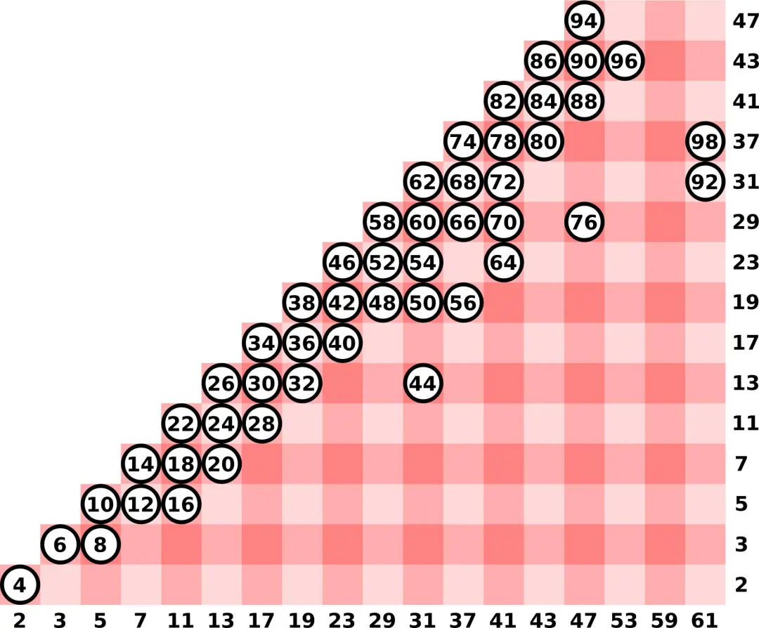 哥德巴赫猜想说,每个大于二的偶数都可以表示为两个质数的和。例如,4是2和2的和,都是质数。28是17和11的和,都是质数。你对任何偶数这样做都行。这个看似简单的猜想已经无法证明近300年,但到目前为止,我们知道它对于所有小于 4×10¹⁸的偶数成立。