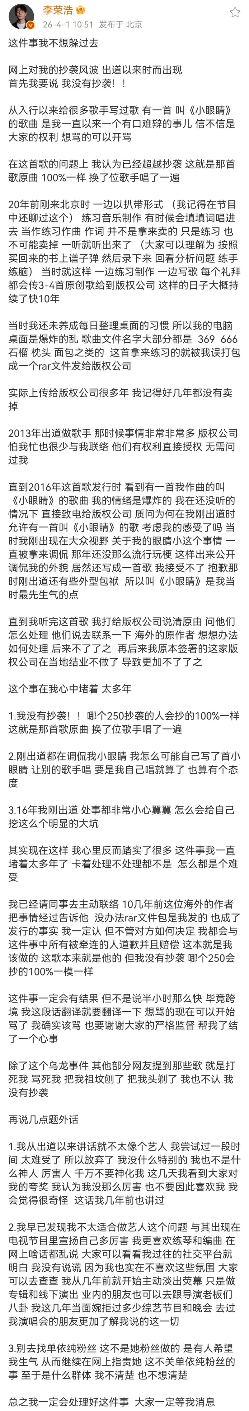 4月1日,歌手李荣浩发长文回应《小眼睛》被指抄袭,他称2000年代在北京从事音乐幕后工作时,曾将平井坚《Signal》的扒带练习文件(填词翻唱版)误打包发送给版权公司,后续因签约公司倒闭、沟通中断,导致2015年署名自己作曲的《小眼睛》被蔡淳佳发行。他坚称这是“误传非商用练习作品”,否认抄袭,并表示已主动联系海外原作者处理赔偿。