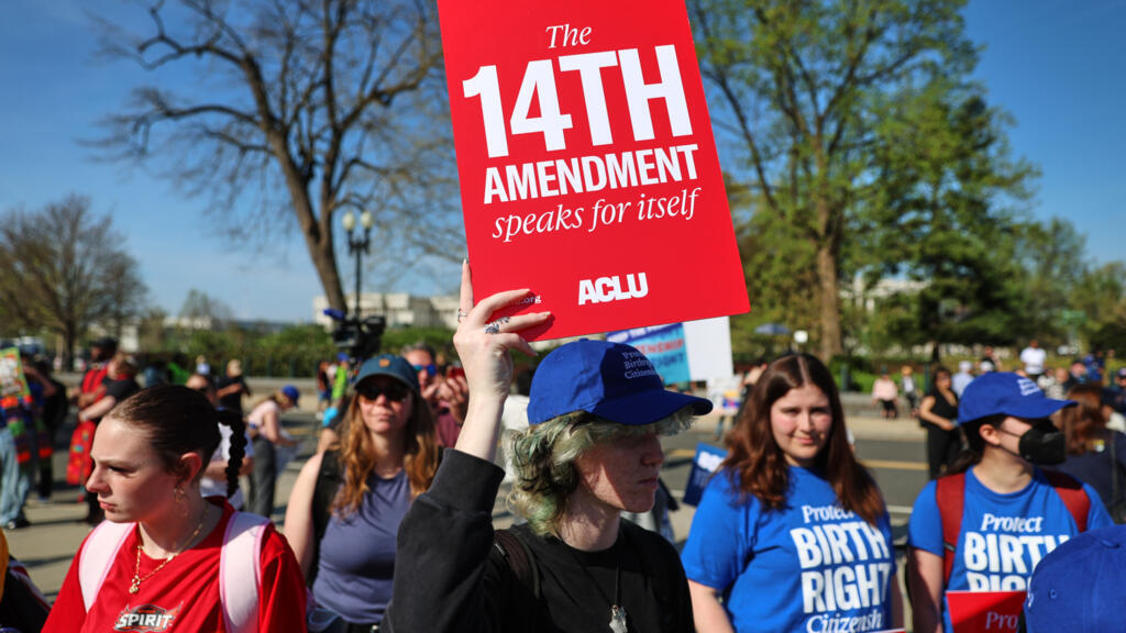 2026年4月1日,一些民众在美国最高法院门外集会,捍卫宪法第十四修正案赋予的出生公民权。当日,最高法院就总统特朗普取消出生公民权行政命令的合法性展开辩论。 AP - Tom Brenner