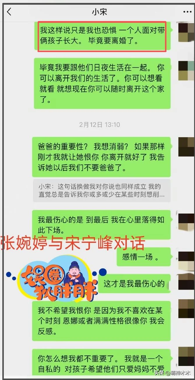 再根据张婉婷和宋宁峰的聊天记录,也发现两口子对离婚的态度截然不同。2月12日,宋宁峰向张婉婷提出离婚,张婉婷连续发十几条文字,描述离婚后要和孩子面临的窘境,比如“一个人带两个娃”、“如何解释爸爸离开家”等,宋宁峰则偶尔回一句,不是催时间就是PUA张婉婷弱化爸爸存在感。