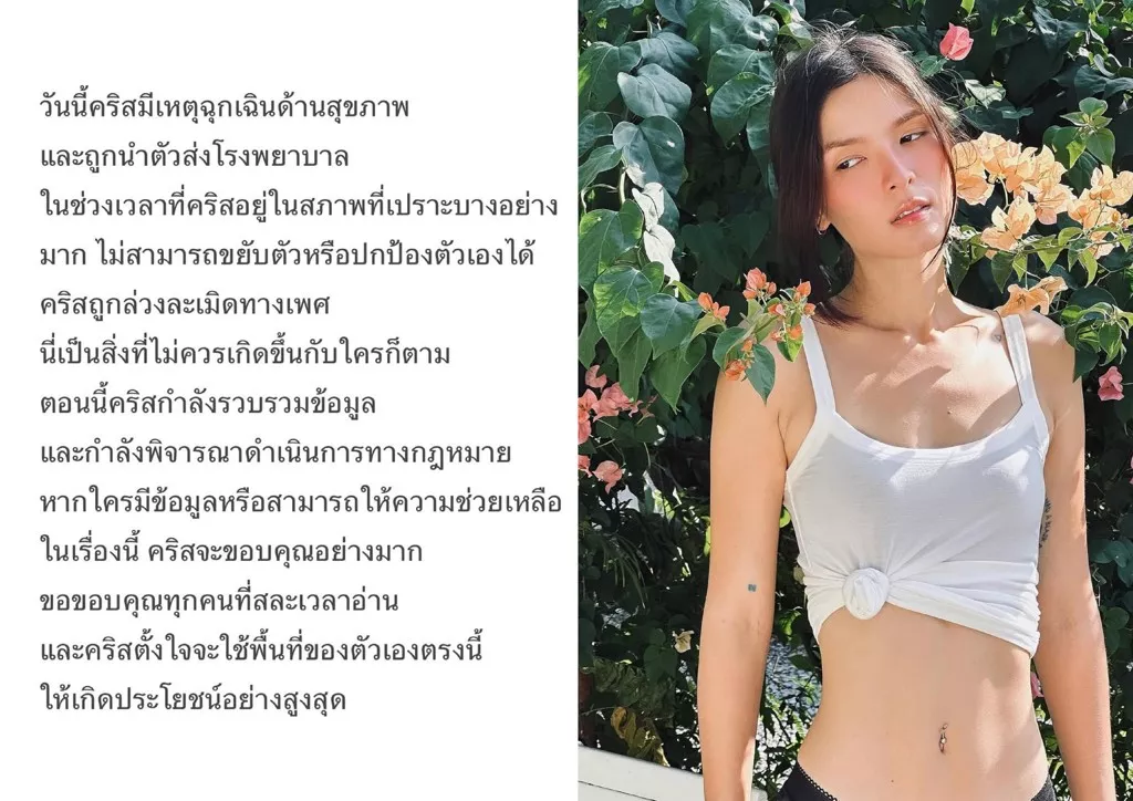 泰国演艺圈近日爆发一起震惊社会的性侵案件。30岁泰国女星兼模特儿Christine GulasatreeMichalsky(克莉丝汀)日前透过IG社群揭露,她因生病虚弱叫救护车,竟在自家公寓内遭到男性救护人员性侵及猥亵,甚至被拍下裸照。此恶劣行径不仅引发泰国社会公愤,全球网友也纷纷涌入声援,要求严惩。