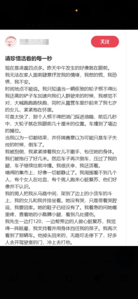 她写道:“我被刮倒,我紧紧搂着我女儿不撒手,抱住她的身体,我们被拖行了好几米。然后车子再次倒车,压过了我的腿 ,车子继续往前冲撞。我很庆幸,我还活着。”
