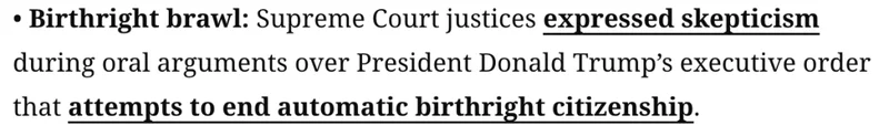 但今天的口头辩论,对于特朗普一派,似乎极为不利。最高法院大法官在口头辩论中对特朗普总统试图终止自动出生公民权的行政命令表示怀疑 。