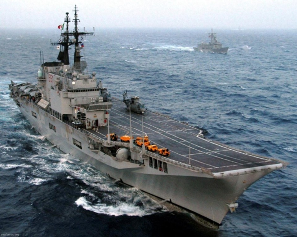 该舰全长180.2米,宽30.4米,搭载四台LM2500燃气轮机,最高航速30节,7000海里的续航能力足以支撑远洋部署,舰上可搭载16-18架舰载机,既能搭载海鹞垂直起降战机,也可适配多款直升机,服役期间参与过索马里维和、科索沃危机、利比亚战争等多次军事行动,实战经验极为丰富,是意大利海军曾经的远洋核心。