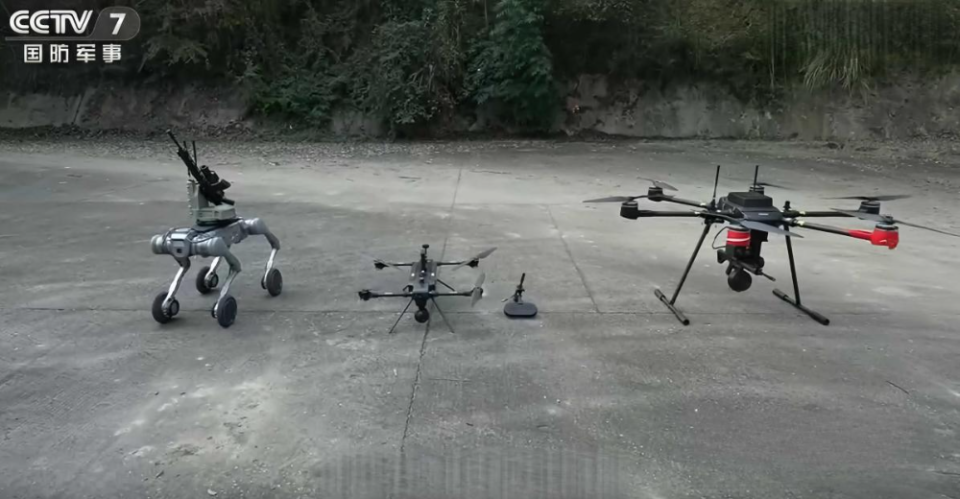 (从左至右)机器狼、一体式无人飞枪和吊舱式无人飞枪。图/央视网