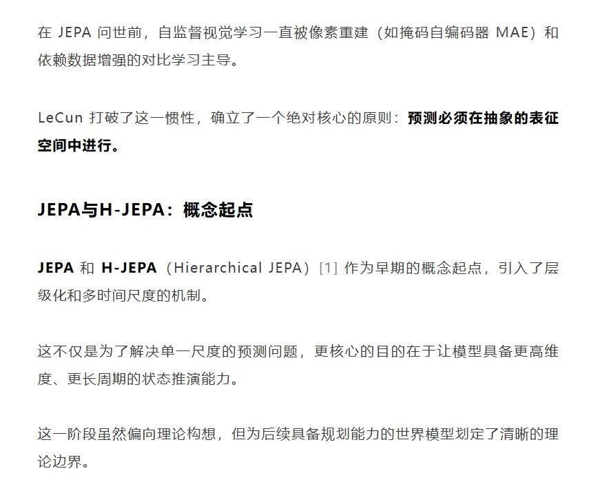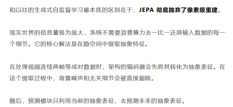 面对主流自回归模型在物理常识和多步规划上的局限,JEPA(联合嵌入预测架构)给出了另一种思路:彻底放弃底层的像素重建,直接在抽象的特征空间中预测未来状态。