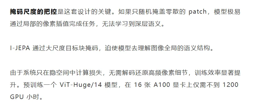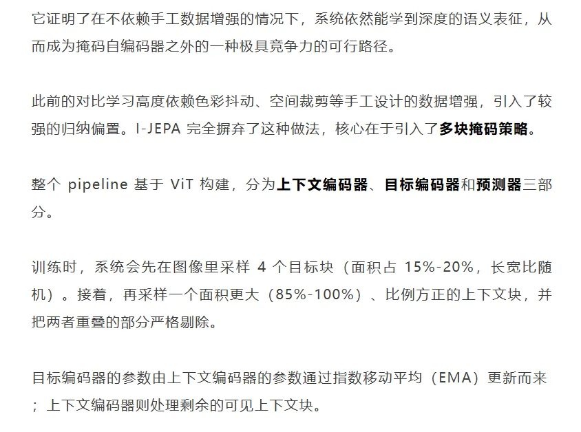 I-JEPA(Image-based JEPA)[2] 是将理论转化为工程实现的关键节点。