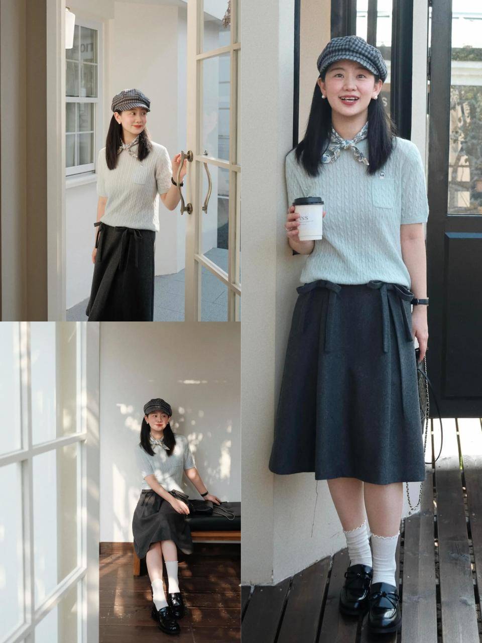 Tips ③:灰色格纹小香风+黑色半裙