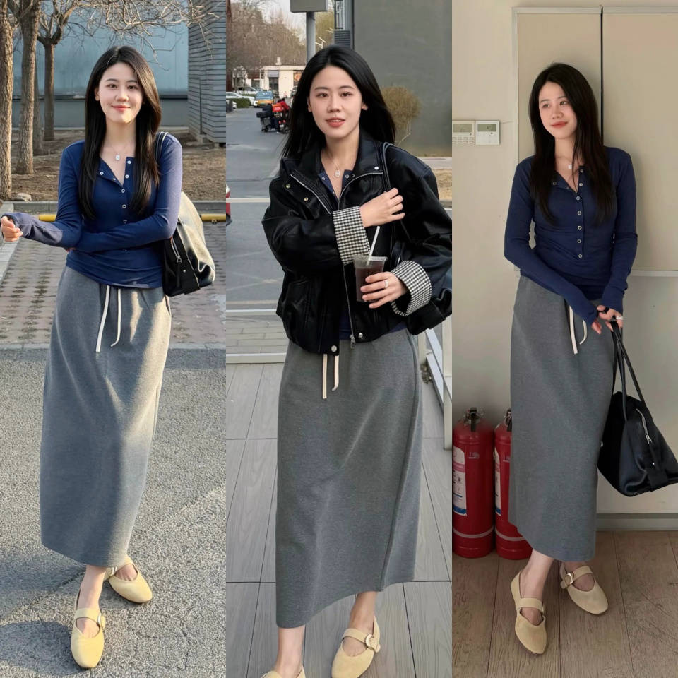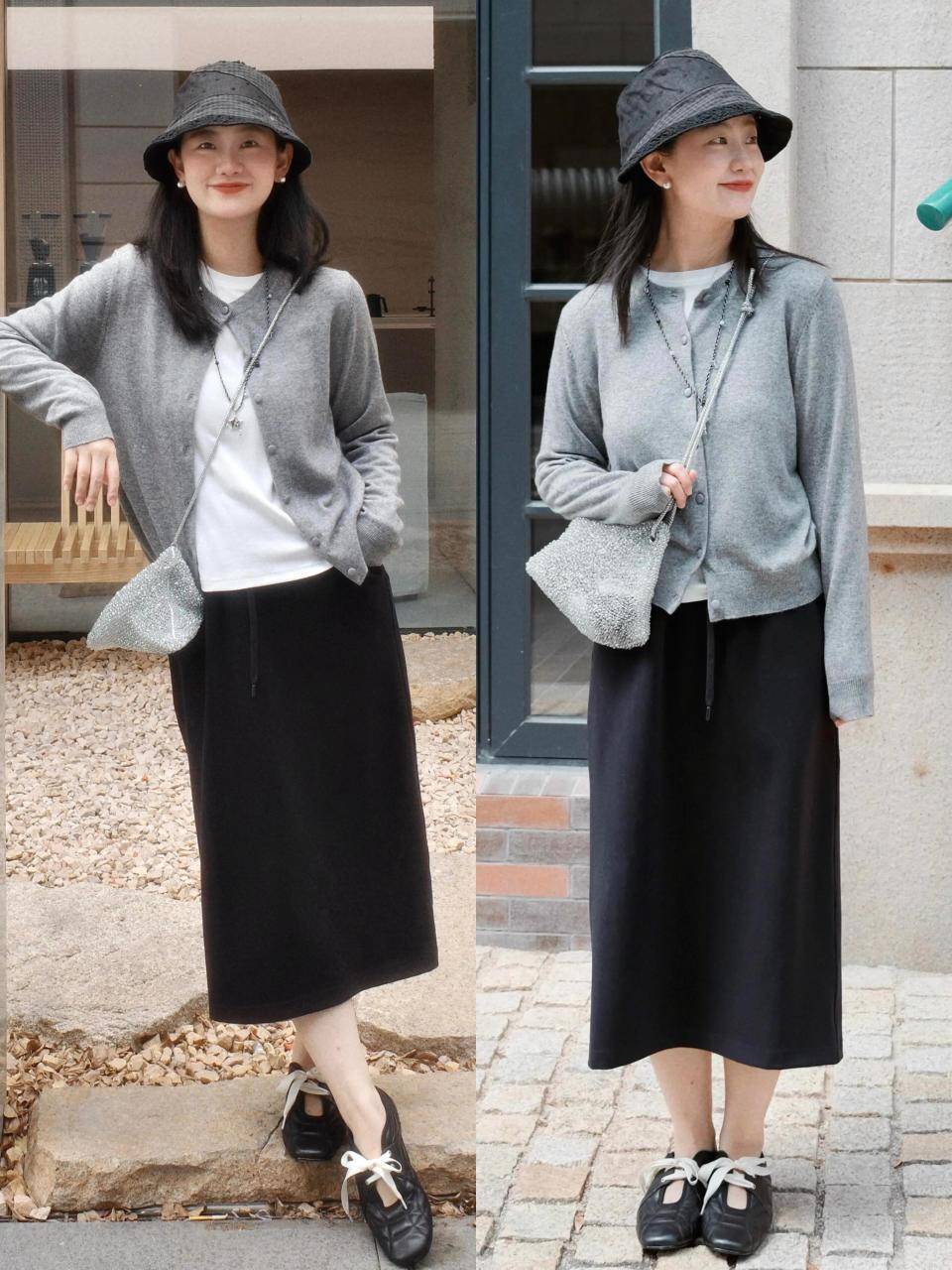 Tips①:灰色开衫+黑色直筒半裙