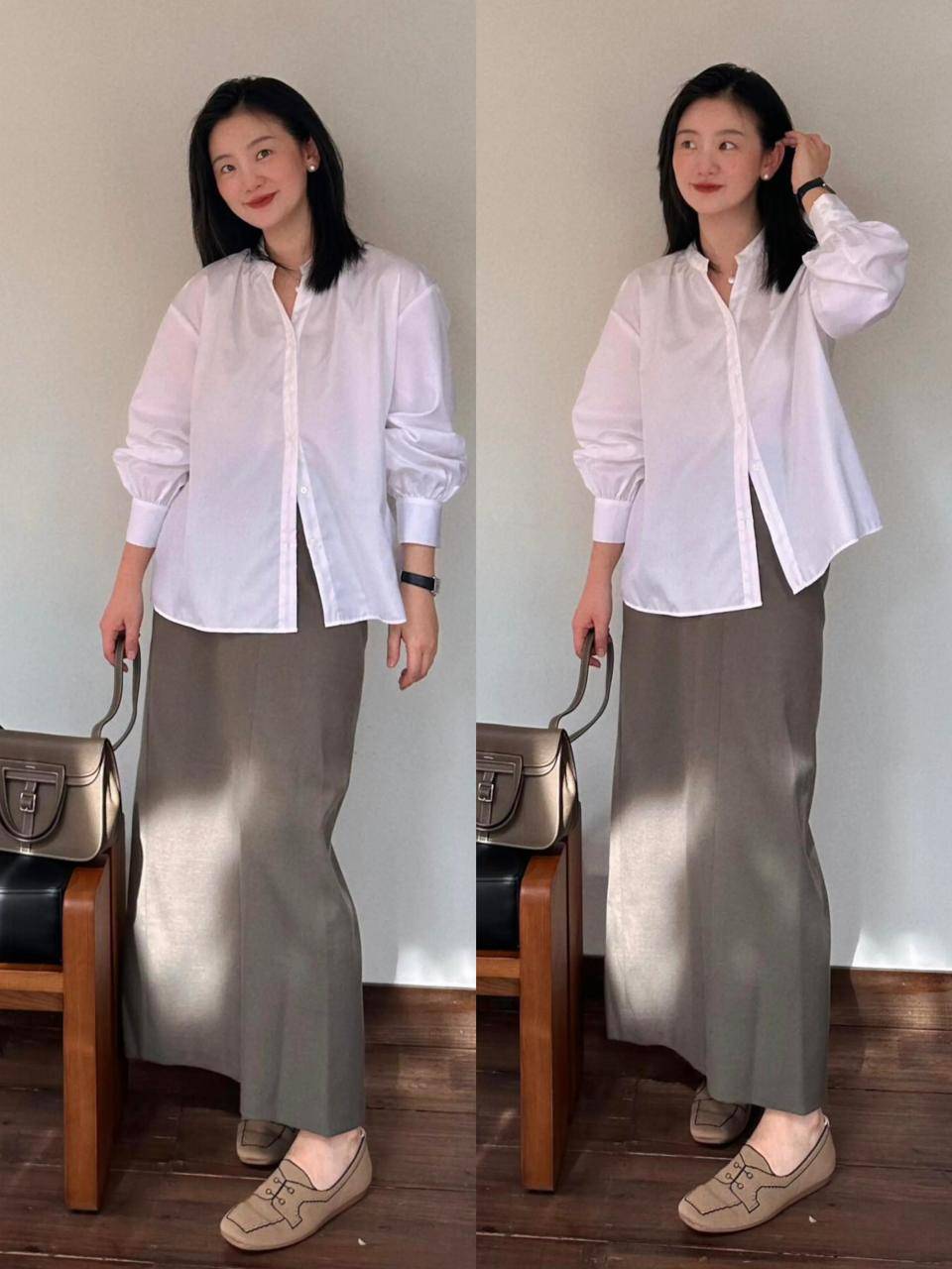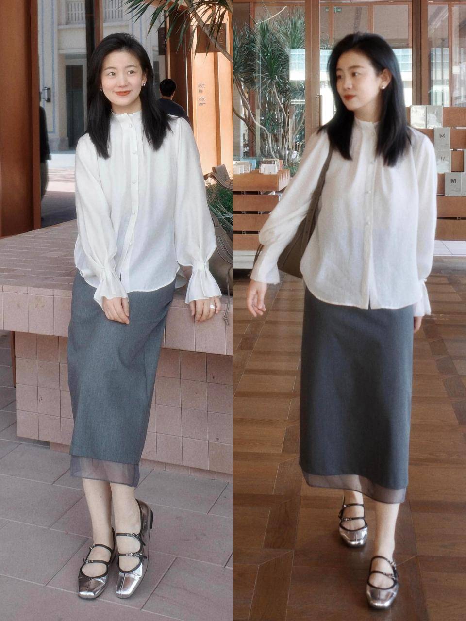 Tips②:白色立领衬衫+灰色直筒半裙