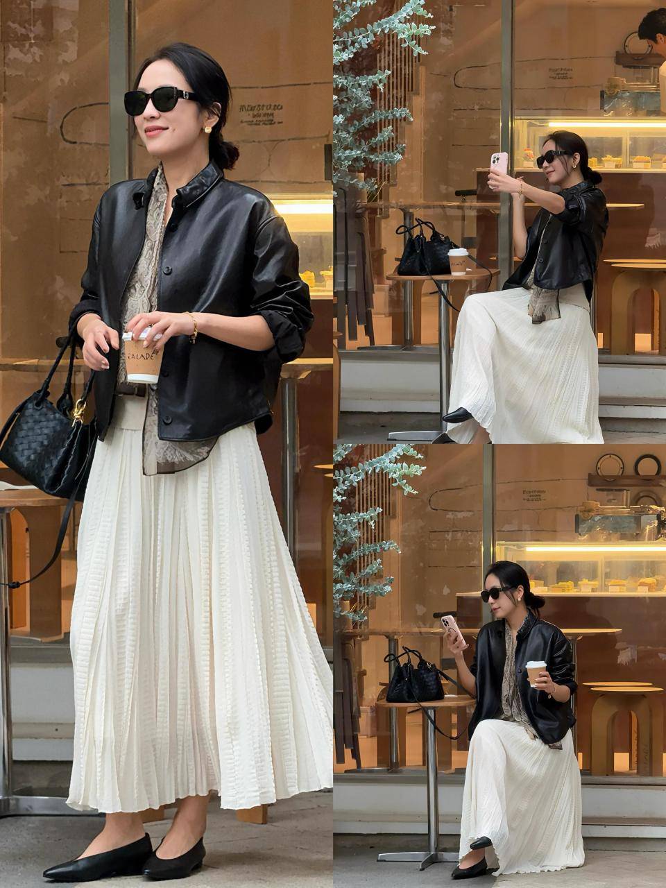 黑白搭配永远不会过时,经典耐看,只要衣服的质感足够好,穿在身上就显贵。例如上面有一款黑色皮衣外套,配上白色的百褶伞裙,脚踩黑色低跟单鞋,这样的穿搭又飒又美。