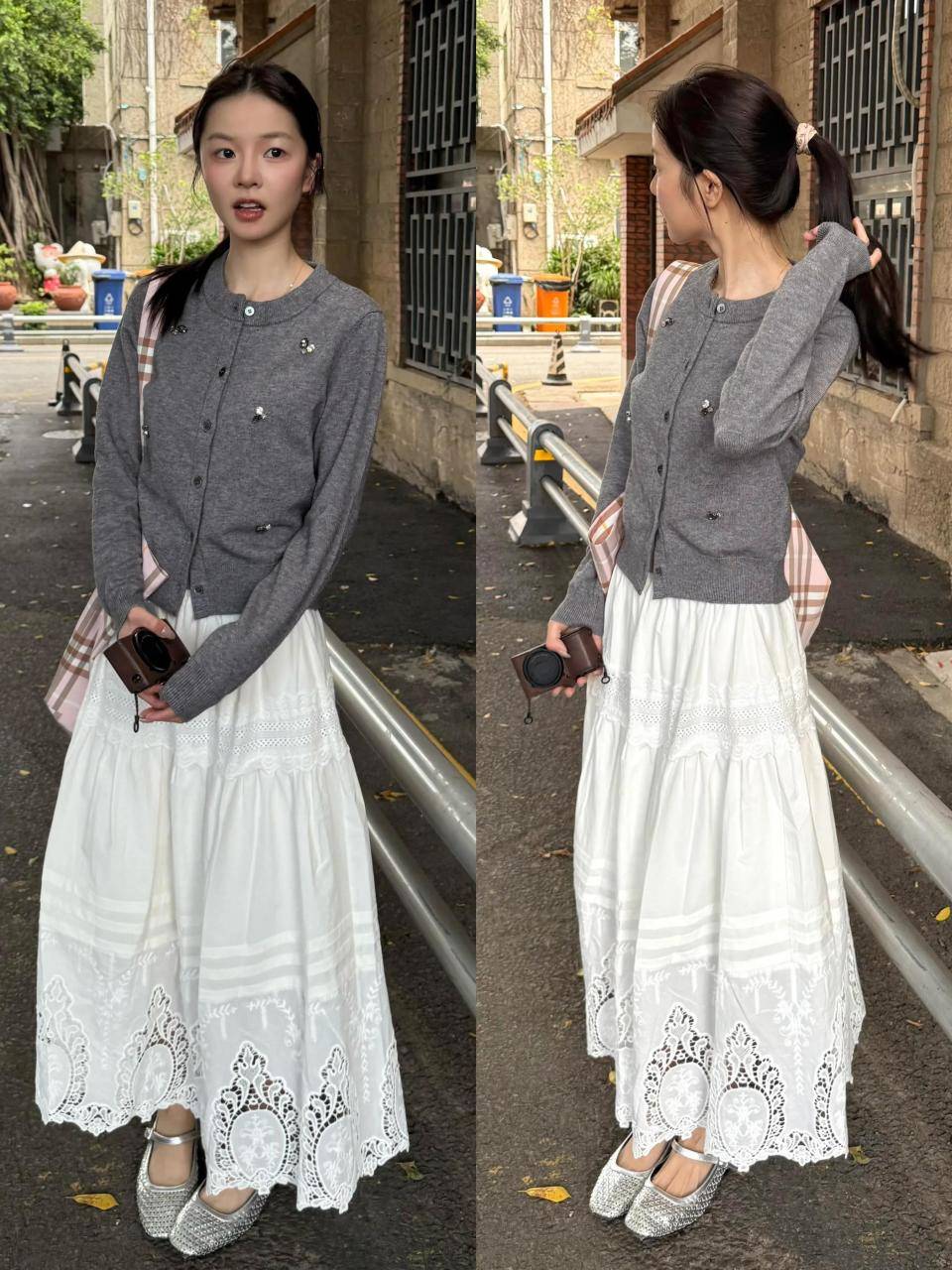 日常穿搭想要更简约一点,不妨直接选择最为基础的灰色针织开衫来穿搭就够,穿在身上软糯亲肤,百搭耐看。下半身选择一条白色的伞裙,脚踩银灰色的浅口低跟单鞋,就能让你呈现出少女的气息,元气满满。