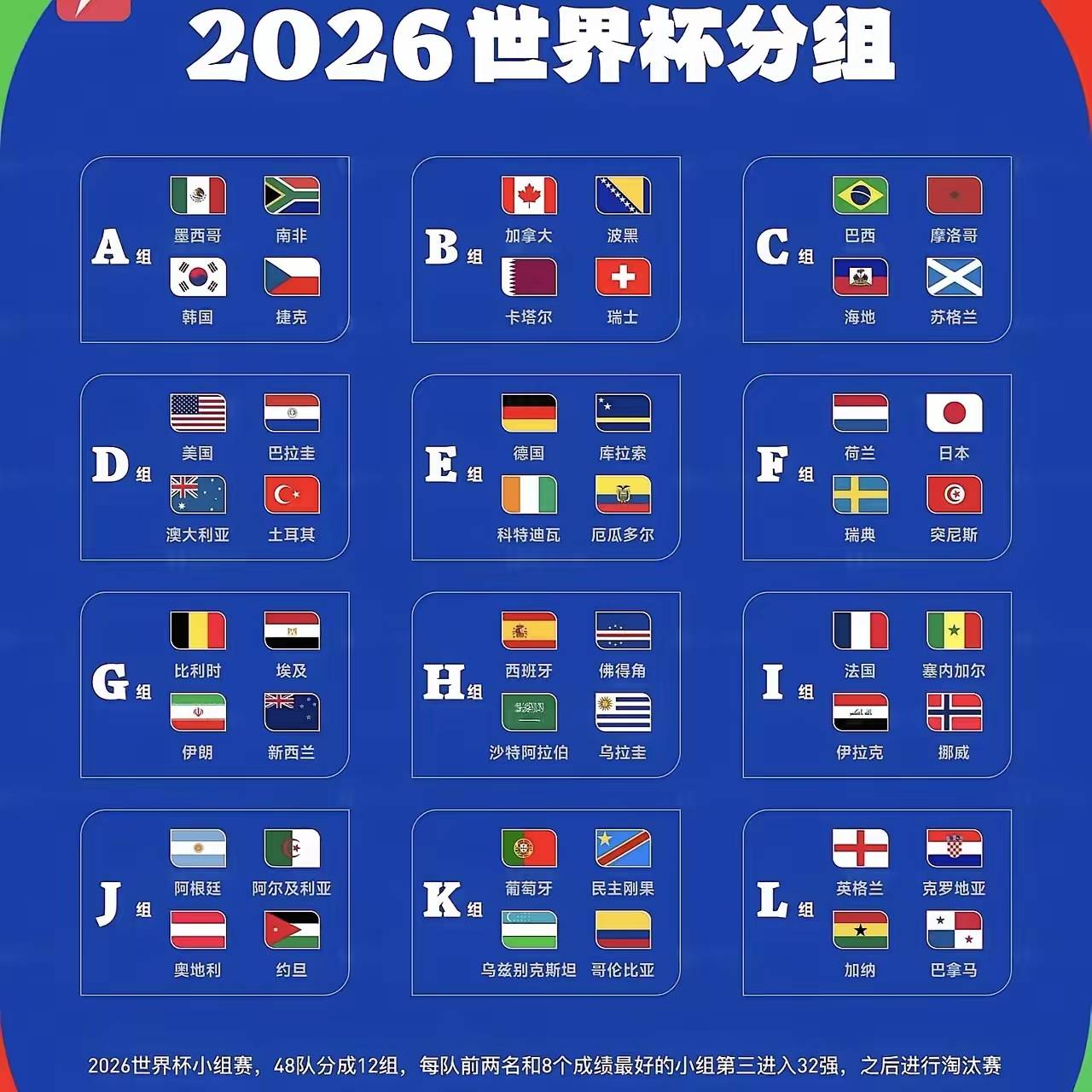 至此,随着各大洲预选赛的尘埃落定,2026年美加墨世界杯的四十八支参赛球队也已全部揭晓,他们的具体分组如下: