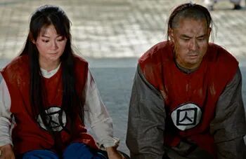 一男一女被关在木笼里面,他们身着红色囚服,引颈笼外,望着前方熙熙攘攘的人群。