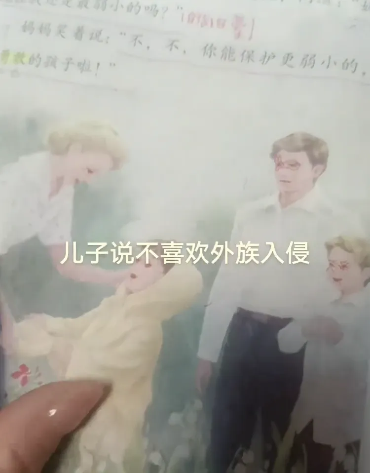 聊下网上一名母亲发的视频,内容很简单,她一边翻自己孩子的课本,一边发出快乐的笑声,因为正在上二年级的孩子不喜欢外国人,所以把课本里所有涉及外国人的人物插画的眼睛都涂成了红色。