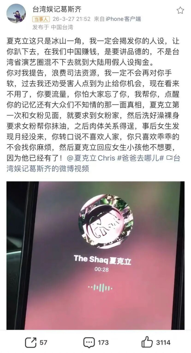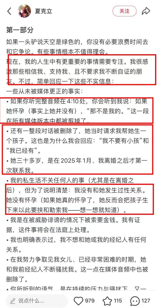 夏克立在社交账号发文否认睡粉,还表示泄露的录音其实被剪辑过,事实上这位粉丝并没有怀孕。
