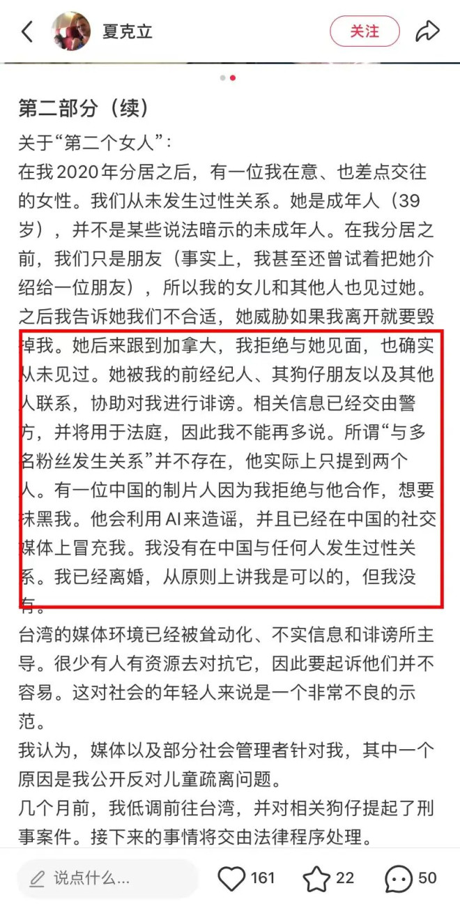 夏克立在另一个续篇里提到,2020年他和黄嘉千分居后,他在意的一个39岁的女子,差点交往。她是成年人,并不是未成年,和前妻分居后他们只是朋友。所以他女儿夏天也见过这个女性。
