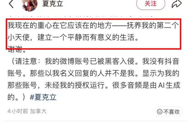 夏克立说现在的重心在它应该在的地方,他抚养自己的第二个小天使,建立一个平静而有意义的生活。他的微博被黑客入侵,抖音没有账号,他在小红书发文。其他所谓的账号发布的AI作品都不是他自己的,因为没有他的授权。