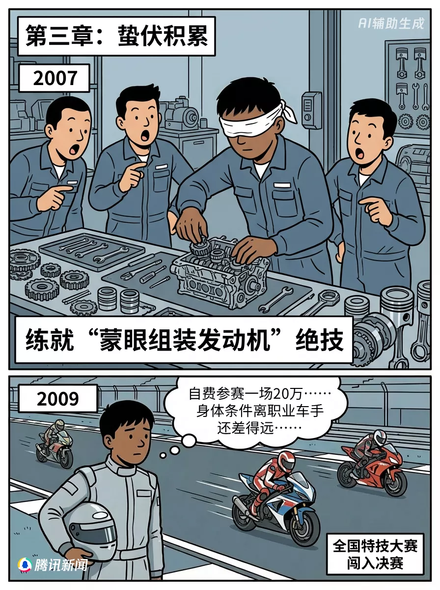 同年,张雪参加全国特技大赛,闯入决赛。但亲身训练和参赛,让他认识了残酷的现实:自己的身体条件,距离成为职业车手,相差甚远。更为现实的困窘是,自费参加一场比赛要20万,他根本没有这份底气。