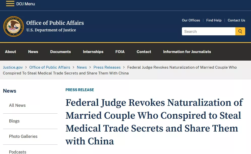 司法部网页:联邦法官撤销一对夫妇的入籍资格,他们合谋窃取医疗商业机密并将其分享给中国(截图) 犯罪历史