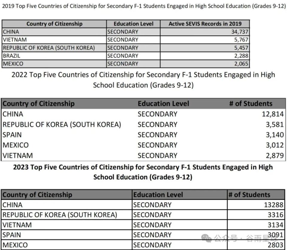 美国国土安全局(DHS)和美国教育协会(IIE)2017年数据显示:十年间赴美就读高中的中国学生人数增长高达98.6倍,最高人数达到3.4万人,远超研究生的1.6倍和本科的14倍。