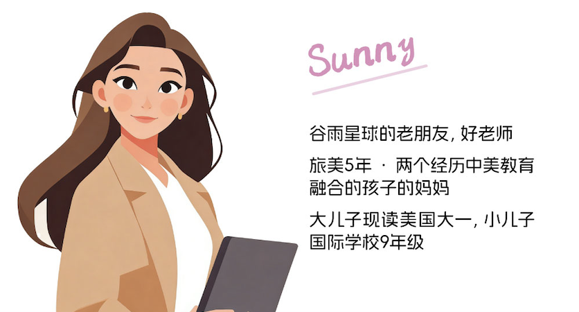 Sunny旅美五年,两个孩子,一个刚进美国大一,一个还在国内国际学校读九年级。一个走出去了,一个留下来了。中美两边的教育她都不是旁观,是自己趟过来的。