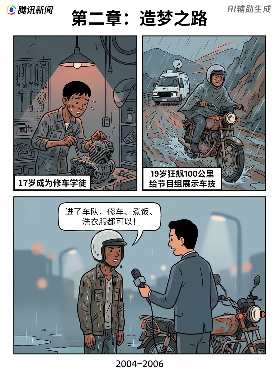 但张雪并没有气馁,第二天他骑着有20年车龄、比自己年纪还大的旧本田摩托车,跟着摄制组的车在雨中狂飙了3个多小时。