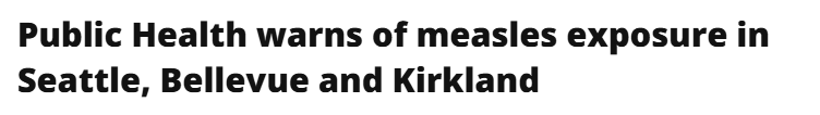 据报道,西雅图及金县公共卫生局近日发布紧急通告:由于大西雅图地区确认了新的麻疹病例,多处公共场所存在潜在的病毒暴露风险。