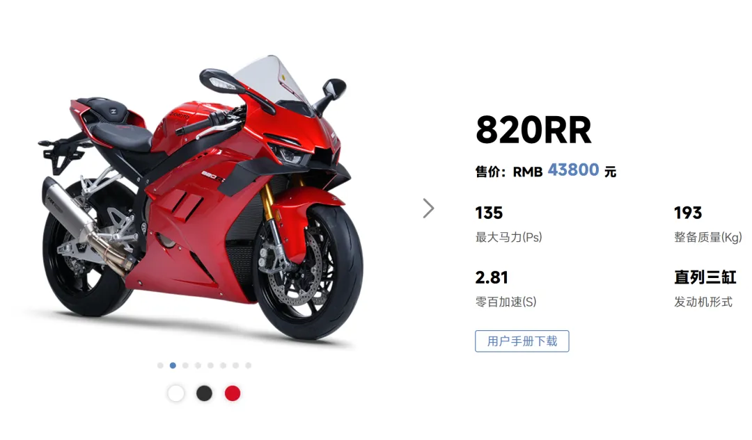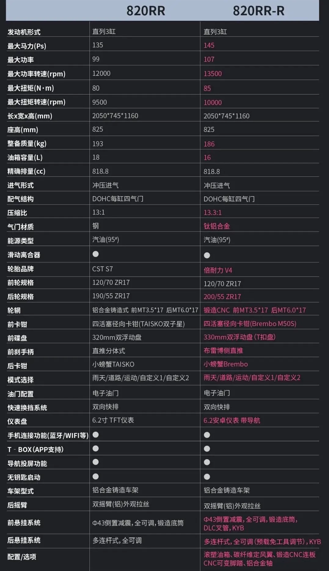 性能这么猛的一台车,价格只要43800元,让很多摩友直呼良心。那么我为什么建议你先别急着下单呢?因为三个月后,还有更猛的820RR-R,最大功率提升至107kW,最大扭矩提升至85N·m,整备质量减轻至186kg,气门材质从钢升级为钛铝合金,刹车卡钳也从TAISKO双子星升级为Brembo M50S,避震升级为KYB竞技级全可调减震,还增加了碳纤维定风翼、CNC可变脚踏、铝合金轴等配置,更接近赛车。最重要的是,820RR-R的价格只比820RR高出1.8万元。要是你,会立刻下单820RR还是等一等820RR-R呢?