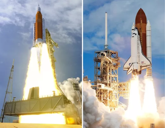 执行本次发射任务的是一款叫Block1的火箭,从外形和涂装上也能猜得出来,这款火箭实际上是从航天飞机演变而来。两侧细长的固体火箭助推器,橙色的芯级火箭,无不透露出航天飞机的影子。